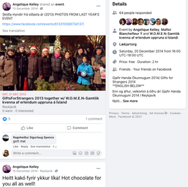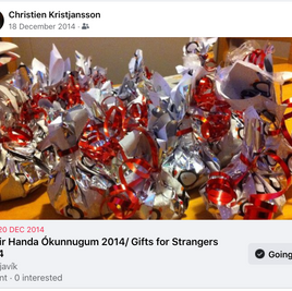 Join Gifts For Stranger Event together with W.O.M.E.N-Samtök kvenna af erlendum uppruna á Íslandi . Those interested groups or individuals are welcome to join. We will be meeting Austurvöllur, outside Café Paris in Austurstræti, 101 on Saturday, December 21st- Time.18:45