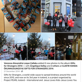 Iceland 1st GFS: The 2012 Gifts for Strangers mission started outside the Landsbankinn, Austurstræti 11, 101 Reykjavik on Sunday, December 16th - Time. 16:00 . Maflor Svandís of JLK JLU Mission started this event a few years back after her cousin Lisa Goebel took participation in GFS Canada. With friends, Maria from Colombia, Toshiki from Japan, Linda and Katrin from Iceland, Christien from Iceland/South Africa, University exchange students/volunteers and her mom Lelita Rós came out to hand out gifts and hugs to strangers in Iceland.